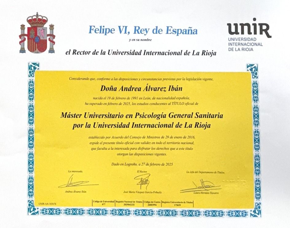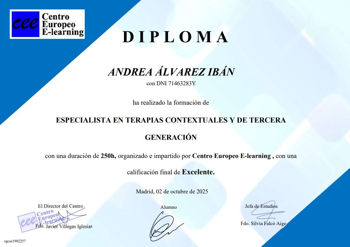 Hola, soy Andrea Álvarez, psicóloga especializada en Psicología General Sanitaria, formada en la Universidad Nacional de Educación a Distancia y en la Universidad Internacional de la Rioja. También soy Especialista en Terapias Contextuales y de Tercera Generación, un enfoque que integra estrategias basadas en la aceptación, la atención plena y los valores personales para favorecer un cambio profundo y sostenible.